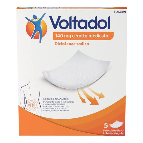 Solo per uso cutaneo. Posologia: Voltadol deve essere applicato solo sulla cute intatta e sana e non deve essere applicato quando si fa il bagno o la doccia. Voltadol deve essere utilizzato per il piu' breve tempo possibile. Adulti e adolescenti dai 16 anni in su: applicare un cerotto 2 volte al giorno, al mattino ed alla sera, sulla cute della zona da trattare, per un periodo non superiore a 7 giorni. Non superare la dose raccomandata. Se non si riscontra un miglioramento o se viene riferito un peggioramento dei sintomi dopo 7 giorni di trattamento, rivalutare la situazione (vedere paragrafo 4.4). Popolazioni speciali. Bambini e adolescenti al di sotto dei 16 anni: Voltadol e' controindicato nei bambini e negli adolescenti di eta' inferiore ai 16 anni (vedereparagrafo 4.3). Anziani e pazienti con insufficienza epatica o renale: Voltadol deve essere impiegato con cautela (vedere paragrafo 4.4). Modo di somministrazione: 1 Tagliare la busta lungo la linea tratteggiata e prelevare il cerotto. Per l'applicazione del cerotto: 2 Togliereuno dei due fogli protettivi. 3 Applicare sulla parte da trattare e togliere il foglio protettivo rimasto. 4 Esercitare una lieve pressionecon il palmo della mano fino alla completa adesione alla cute. Il cerotto deve essere utilizzato intero. Per la rimozione del cerotto: 5 Bagnare il cerotto con acqua e sollevare quindi un lembo tirando poi delicatamente. 6 - Per eliminare gli eventuali residui del prodotto lavarela zona interessata con acqua eseguendo con le dita movimenti circolari.