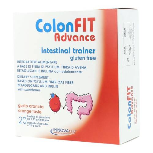 ColonFIT AdvanceDescrizione Integratore alimentare a base di fibra di psyllium, fibra d'avena, betaglucani e inulina. Contiene un mix di fibre alimentari utile al benessere intestinale. Favorisce il fisiologico transito intestinale, aiuta a mantenere sotto controllo i livelli sierici di colesterolo e di glucosio, favorisce il conseguimento della sazietà precoce utile nei programmi di dimagrimento e di controllo del peso corporeo. Con edulcorante. Ingredienti Psyllium (Plantago psyllium L., cuticola del seme), fibra d’ avena, inulina; acidificante: acido citrico; aromi naturali, maltodestrine; emulsionante: lecitina di soia...